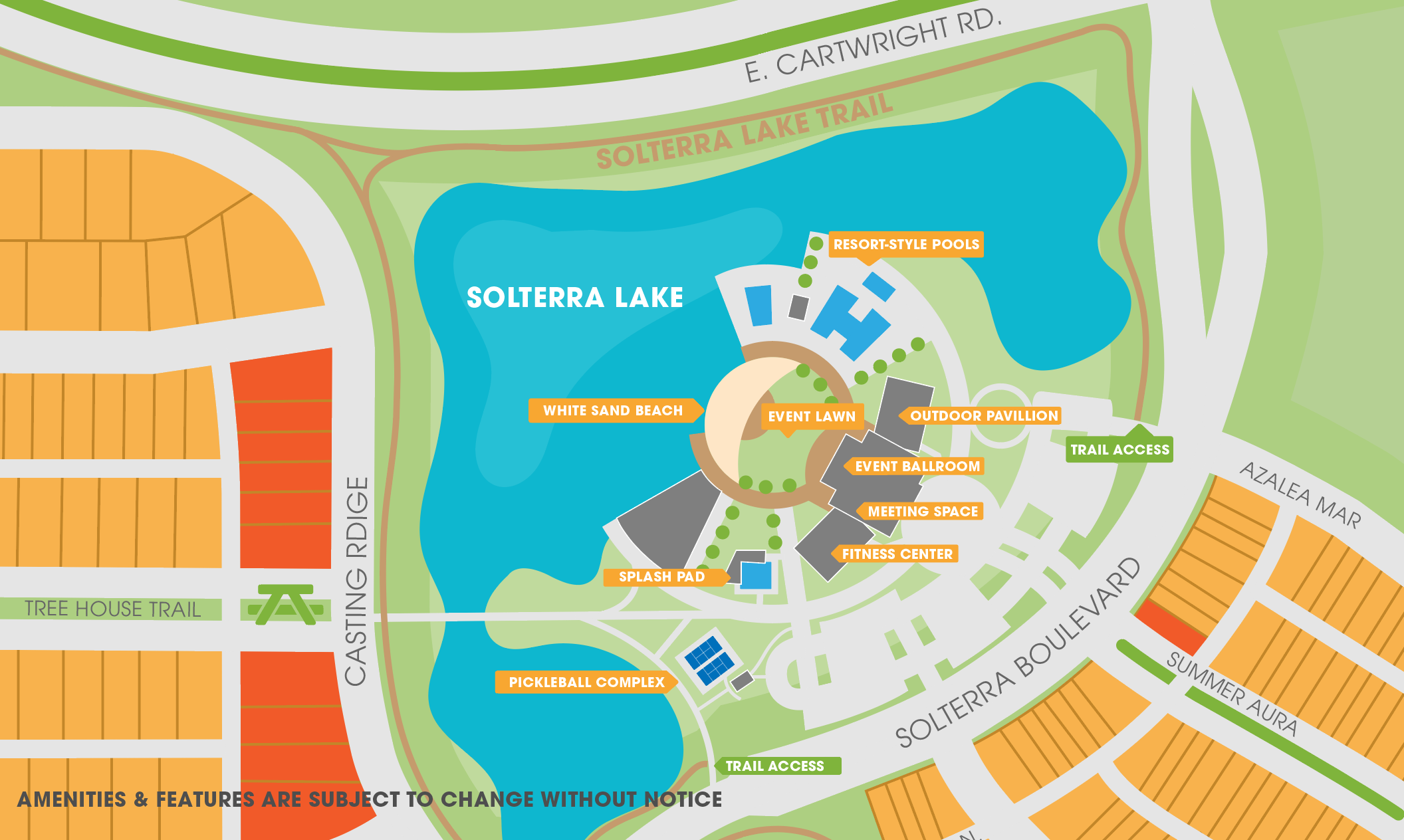 The tranquil 25-acre stocked fishing lake offers endless opportunities for kayaking, paddleboarding, and fishing. With easy access to the shoreline, Solterra Lake makes for the ideal spot to relax and cast a line, surrounded by scenic views.