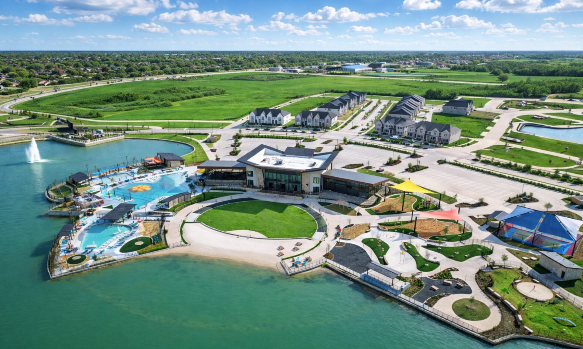 Dive into endless fun with the three-pool complex, catering to all ages and interests. Whether it’s swimming laps, splashing in the kids’ area, or lounging by the sand beach overlooking the lake, there’s something for everyone. For the little ones, the splash pad offers hours of refreshing entertainment, making it a family favorite.Pickleball Complex